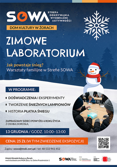 Zapraszamy na Warsztaty Familijne pt. ,, Zimowe laboratorium. Jak powstaje śnieg ? '' do Strefy Sowa dzieci powyżej 6 roku życia wraz w opiekunami na wspólna i kreatywną zabawę ❄️☃️